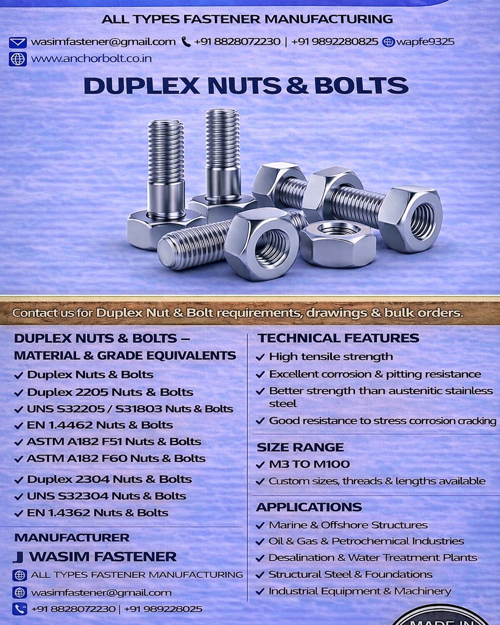 Duplex fasteners are ideal for marine & offshore structures, oil & gas pipelines, desalination plants, petrochemical industries, structural steel, and heavy engineering applications. We also offer custom sizes, special threads, surface finishes, and project-specific fasteners as per client drawings.