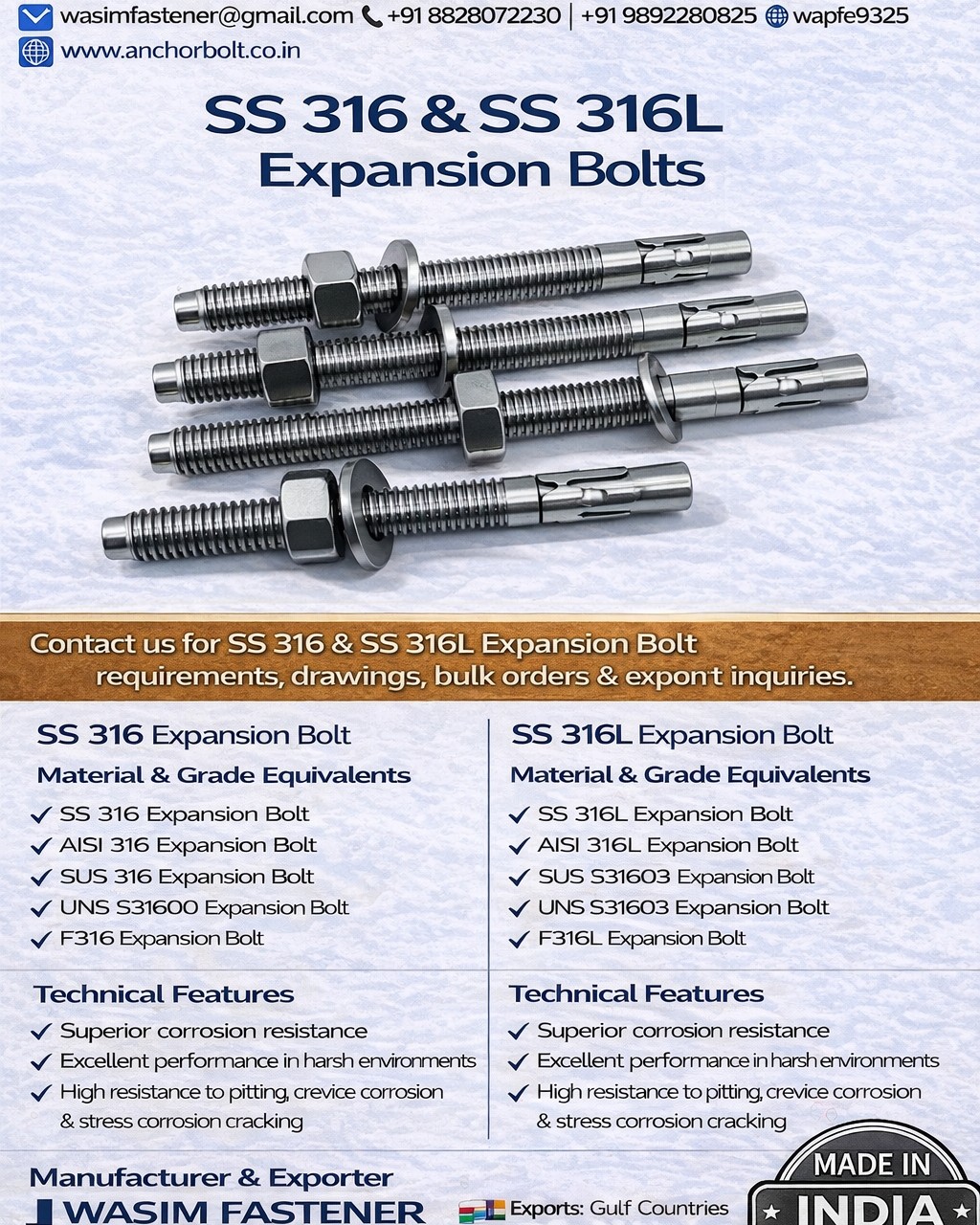 As a trusted SS 316 & SS 316L Expansion Bolts manufacturer and exporter in India, we supply customized sizes, lengths, and specifications from M6 to M100, strictly as per international standards. Our products are widely exported to USA, Gulf countries, Europe, and worldwide markets, meeting global quality and performance requirements.