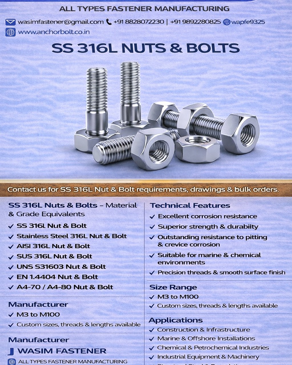 SS 316L fasteners are widely used in construction & infrastructure, marine & offshore installations, chemical & petrochemical plants, oil & gas projects, industrial equipment, and structural foundations.