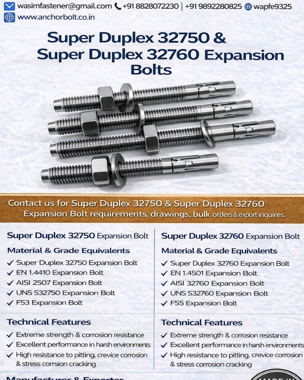 If your project demands maximum strength, extreme corrosion resistance, and long-term reliability, Super Duplex 32750 & 32760 Expansion Bolts are the ideal anchoring solution.