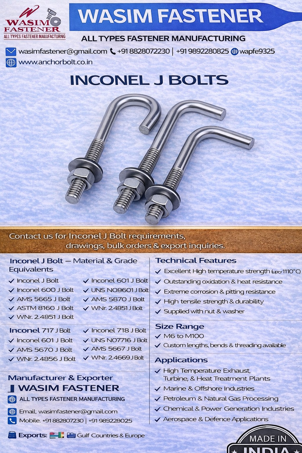 Inconel J Bolts Manufacturer & Exporter | Inconel Anchor & High Temperature J Bolts Inconel J Bolts Supplier | Inconel 600, 625, 718 High Strength Anchor Bolts Inconel J Bolts are nickel-based superalloy anchor fasteners specially engineered for extreme temperature, high pressure, and severe corrosive environments. Manufactured from premium grades such as Inconel 600, Inconel 625, and Inconel 718, these J bolts deliver outstanding mechanical strength, excellent oxidation resistance, and superior performance under thermal stress. Inconel J Bolts are widely used in aerospace, oil & gas, petrochemical plants, power generation, nuclear facilities, heat exchangers, gas turbines, marine, and offshore applications, where conventional stainless steel fasteners fail. These bolts retain strength at very high temperatures and offer excellent resistance to chloride stress corrosion cracking, carburization, and sulfidation. Our Inconel J Type Anchor Bolts are supplied with matching Inconel nuts and washers and are available in M6 to M100 sizes, including custom lengths, threading, and bend dimensions as per drawings and project requirements. Each bolt is manufactured with strict quality control to meet international standards and critical industrial specifications. As a trusted Inconel J Bolts manufacturer and exporter in India, we supply high-performance fasteners to USA, Europe, Gulf countries, and worldwide, ensuring reliability, safety, and long service life in the most demanding environments. Inconel J Bolt Inconel Anchor Bolt Inconel Foundation Bolt Inconel 600 J Bolt Inconel 625 J Bolt Inconel 718 J Bolt Nickel Alloy J Bolt High Temperature J Bolt Heat Resistant J Bolt Corrosion Resistant J Bolt Inconel Fasteners Inconel Bolt Manufacturer Inconel Bolt Supplier Inconel Bolt Exporter Oil and Gas Fasteners Aerospace Fasteners Petrochemical Fasteners