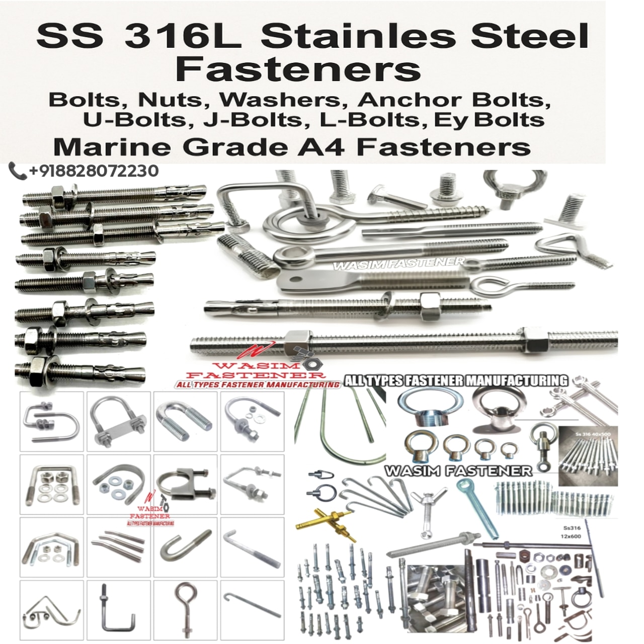 SS 316L Fasteners A4-70 Stainless Steel Fasteners Marine Grade 316L Bolts 316L Hex Bolt Manufacturer 316L Anchor Bolt Supplier 316L Eye Bolt / Eye Nut 316L U Bolt / J Bolt / L Bolt Stainless Steel Fasteners Supplier India 316L Stud Bolt with 2 Nuts 316L Threaded Rod 316L Nut and Washer Set USA: 316L stainless steel bolts, A4 bolts US supplier UAE: SS 316L anchor bolts Dubai, 316L fasteners UAE Saudi: SS 316L bolt supplier KSA UK: A4-316L stainless bolts UK Europe: EN 1.4404 fasteners supplier Singapore: Marine grade bolts 316L SG High-Quality SS 316L Stainless Steel Fasteners – Marine Grade A4 We supply a complete range of 316L (A4) corrosion-resistant fasteners, widely used in marine, offshore, chemical plants, construction, and heavy engineering applications. ✔ Product Range: SS 316L Hex Bolts / Hex Nuts / Washers SS 316L Wedge Anchor / Anchor Bolts SS 316L U-Bolts, J-Bolts, L-Bolts SS 316L Eye Bolts, Eye Nuts SS 316L Threaded Rods & Stud Bolts (with 2 Nuts) Custom fabrication available ✔ Material Grade: Stainless Steel SS 316L (A4 / 1.4404 / F593) Low carbon = superior corrosion resistance Suitable for marine, chemical & outdoor environments ✔ Standards: ASTM A193 / A194 DIN / ISO Standards EN 1.4404 / A4-70 / A4-80 ✔ Size Range: M4 to M100 Custom sizes up to 1000 mm