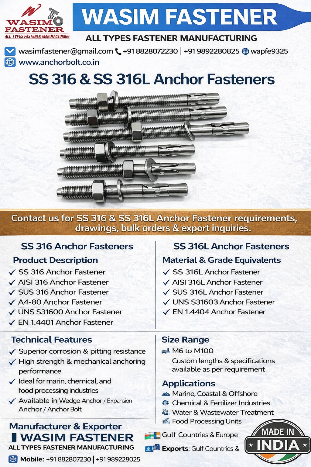 We are a trusted SS 316L Wedge Anchor Bolt manufacturer and supplier in India, offering premium quality stainless steel 316L anchor bolts for highly corrosive and critical applications. Our SS 316L wedge anchor bolts provide excellent resistance against corrosion, chemicals, moisture, and marine environments, making them ideal for oil & gas, chemical plants, desalination projects, wastewater treatment, marine, offshore, and coastal constructions. These stainless steel 316L expansion anchors are designed for strong and reliable fixing in concrete, RCC, and solid masonry. Supplied with nut & washer, our anchor bolts are available in standard and custom sizes such as M8, M10, M12, M14, M16, M18, M20, M22, M24, M25, M27, M28, M30, M36, etc. Optional permanent laser marking (SS 316L / size) is available for project identification. We ensure consistent quality, competitive pricing, fast delivery, and worldwide export to Qatar, UAE, Saudi Arabia, Oman, Kuwait, Africa, and Europe. π MTC as per EN 10204 π¦ Export packing available π Ready stock & project supply π Manufacturer & exporter from India