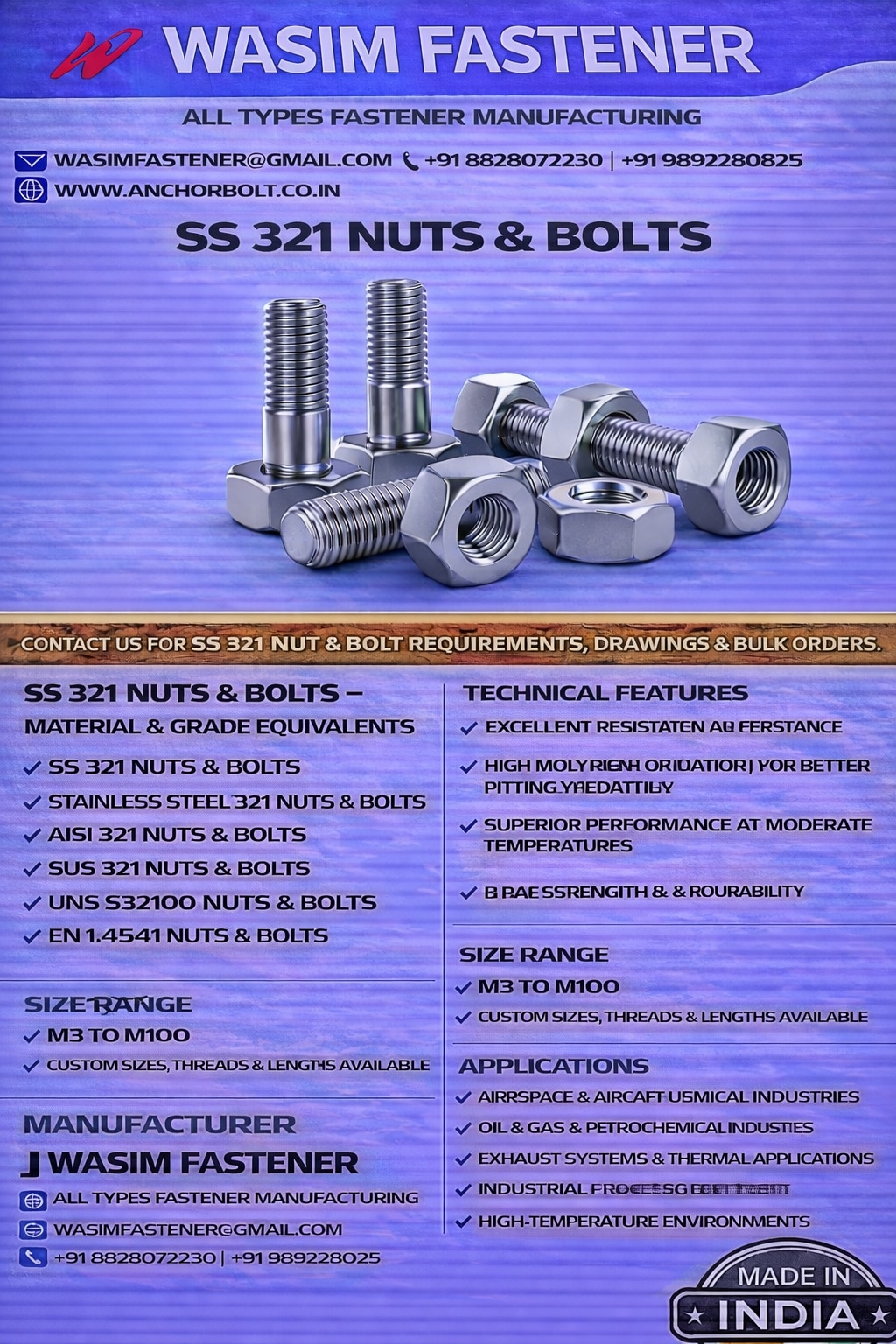 SS 321 Nuts & Bolts Manufacturer & Exporter | Stainless Steel 321 Fasteners Supplier Worldwide Stainless Steel 321 Nuts & Bolts | AISI 321 Fasteners Manufacturer SS 321 Fasteners Supplier in India | Exporter to USA, Europe & Gulf Buy SS 321 Nuts & Bolts | UNS S32100 / EN 1.4541 Fasteners SS 321 Nuts & Bolts manufacturer and exporter supplying heat-resistant stainless steel 321 fasteners worldwide for aerospace, oil & gas and high-temperature applications. SS 321 Nuts & Bolts are titanium-stabilized austenitic stainless steel fasteners designed for elevated temperature applications and resistance to intergranular corrosion after welding. As a reliable SS 321 fasteners manufacturer and exporter, we supply premium-quality fasteners to USA, Europe, Middle East, Africa, and global markets. Our Stainless Steel 321 fasteners are available in AISI 321, UNS S32100, EN 1.4541 and SUS 321 equivalents. These fasteners provide excellent oxidation resistance, superior mechanical strength, and long service life in thermal and corrosive environments. SS 321 Nuts & Bolts are widely used in aerospace & aircraft components, oil & gas industries, petrochemical plants, exhaust systems, heat exchangers, and industrial processing equipment. We manufacture custom sizes, threads, lengths, and finishes with strict quality control, export-standard packaging, and timely worldwide delivery. If you are searching for a trusted SS 321 Nuts & Bolts supplier near you, we deliver consistent quality at competitive prices. SS 321 Nuts & Bolts supplied to: USA, Canada, UK, Germany, France, Italy, UAE, Saudi Arabia, Qatar, Oman, Kuwait, Singapore, Australia, South Africa & Worldwide. ss 321 nuts and bolts stainless steel 321 fasteners aisi 321 nuts bolts uns s32100 fasteners en 1.4541 nuts bolts sus 321 fasteners ss 321 fasteners manufacturer ss 321 fasteners supplier heat resistant stainless steel fasteners high temperature nuts bolts aerospace fasteners ss 321 oil and gas fasteners exhaust system fasteners ss 321 nuts bolts exporter ss 321 fasteners india ss 321 fasteners usa ss 321 fasteners europe industrial stainless steel fasteners π +918828072230 π§ wasimfastener@gmail.com π www.Anchorbolt.co.in