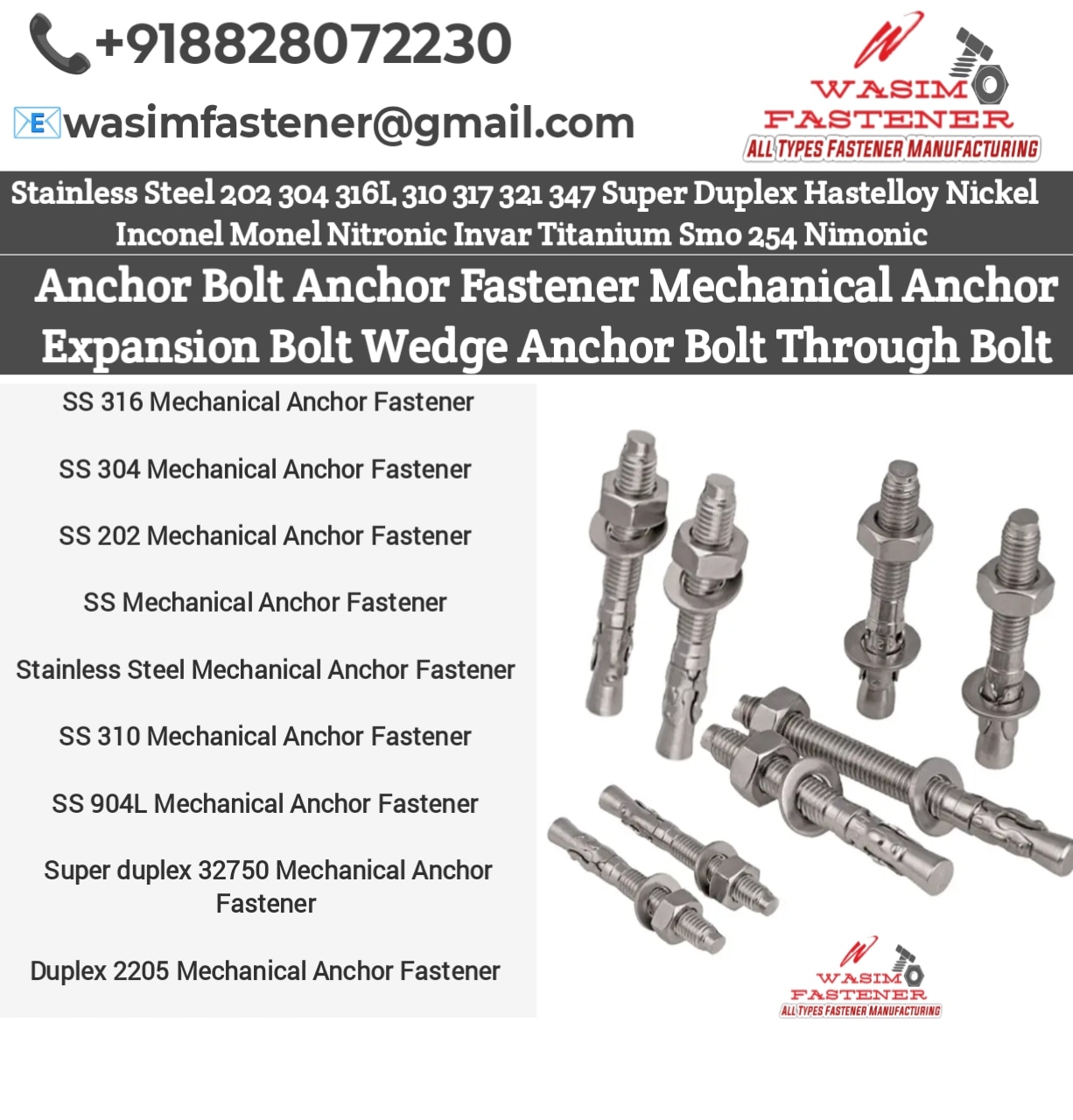 SS 316 Mechanical Anchor Fastener SS 304 Mechanical Anchor Fastener SS 202 Mechanical Anchor Fastener SS Mechanical Anchor Fastener Stainless Steel Mechanical Anchor Fastener SS 310 Mechanical Anchor Fastener SS 904L Mechanical Anchor Fastener Super duplex 32750 Mechanical Anchor Fastener Duplex 2205 Mechanical Anchor Fastener Stainless Steel Mechanical Anchor Fasteners for concrete and heavy-duty fixing — available in SS 202, SS 304, SS 316, SS 310, SS 904L, Duplex 2205 & Super Duplex 32750. High load capacity, vibration-proof grip, rust-free performance and long service life for construction, industrial and marine applications. Available with nut + washer set in all sizes.