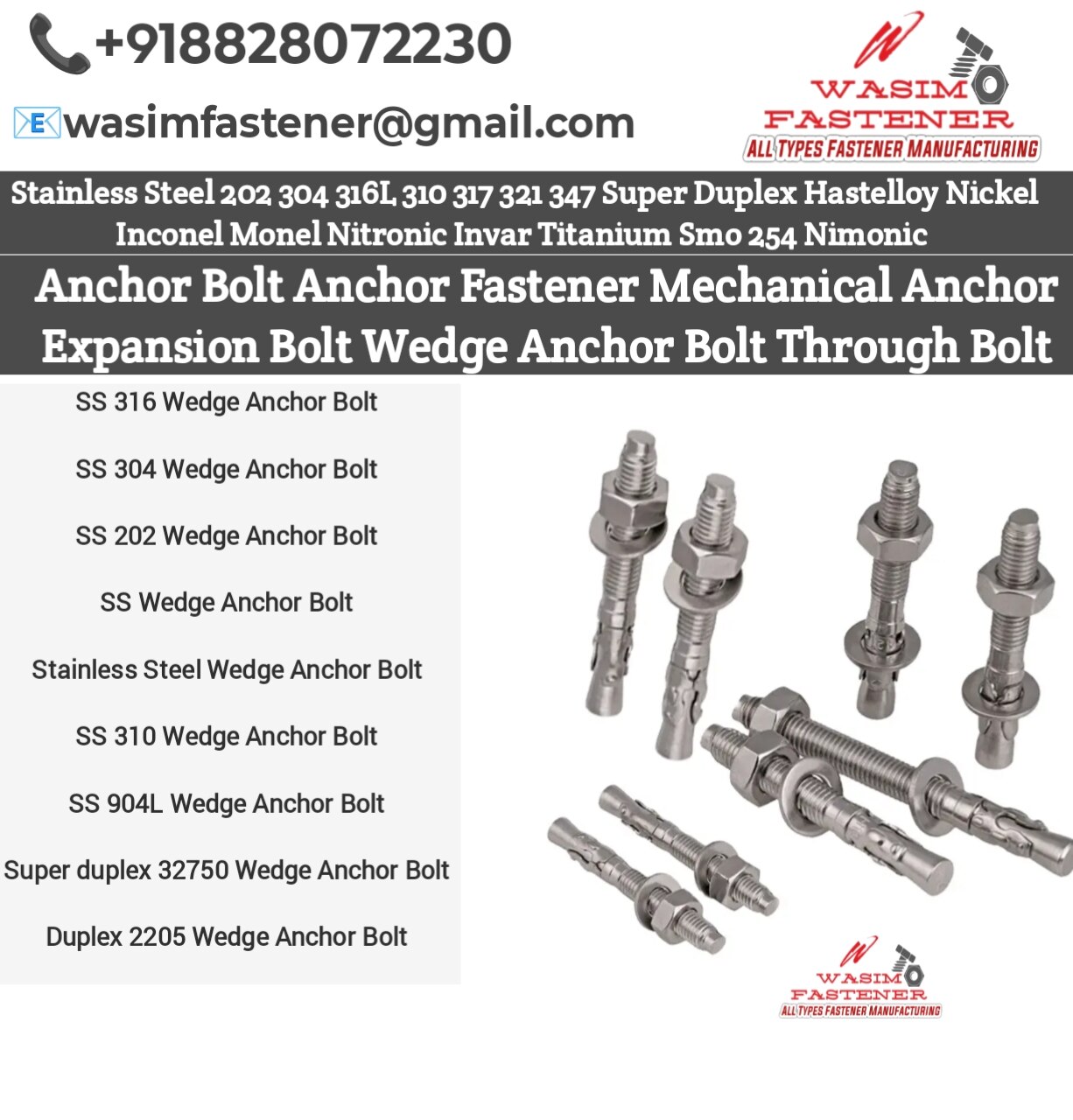SS 316 Wedge Anchor Bolt SS 304 Wedge Anchor Bolt SS 202 Wedge Anchor Bolt SS Wedge Anchor Bolt Stainless Steel Wedge Anchor Bolt SS 310 Wedge Anchor Bolt SS 904L Wedge Anchor Bolt Super duplex 32750 Wedge Anchor Bolt Duplex 2205 Wedge Anchor Bolt Stainless Steel Wedge Anchor Bolt for heavy-duty concrete fixing and RCC structural installation. Available in SS 202, SS 304, SS 316, SS 310, SS 904L, Duplex 2205 & Super Duplex 32750, ensuring maximum pull-out strength, corrosion resistance and vibration-proof locking. Supplied with Nut + Washer and suitable for construction, industrial fabrication, machinery mounting & marine applications. All sizes available for bulk & export orders.