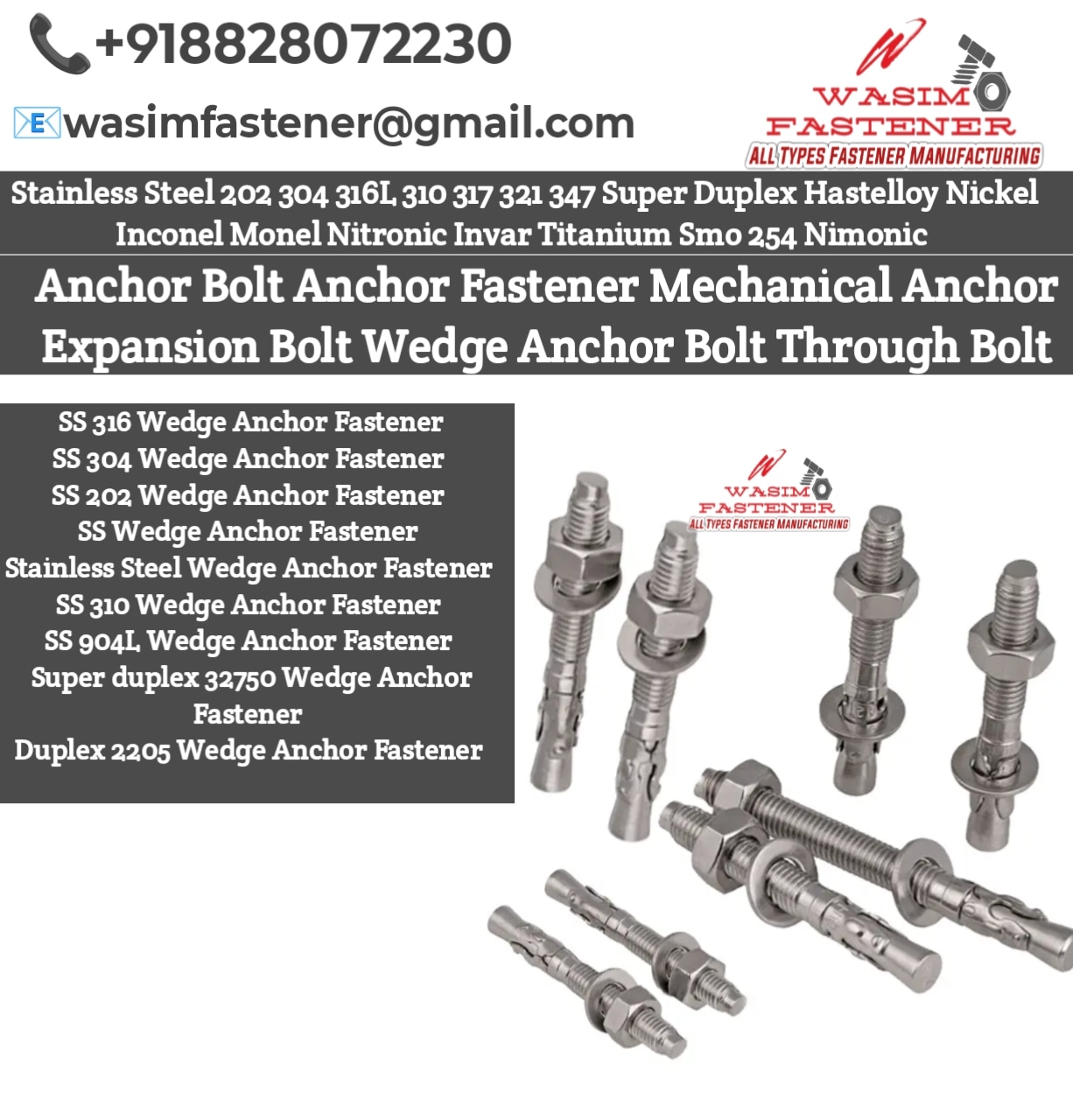 SS 316 Wedge Anchor Fastener SS 304 Wedge Anchor Fastener SS 202 Wedge Anchor Fastener SS Wedge Anchor Fastener Stainless Steel Wedge Anchor Fastener SS 310 Wedge Anchor Fastener SS 904L Wedge Anchor Fastener Super duplex 32750 Wedge Anchor Fastener Duplex 2205 Wedge Anchor Fastener Stainless Steel Wedge Anchor Fastener for heavy-duty concrete anchoring and structural installation. Manufactured in SS 202, SS 304, SS 316, SS 310, SS 904L, Duplex 2205 & Super Duplex 32750, offering superior pull-out strength, corrosion resistance and vibration-proof locking in construction, industrial fabrication, machinery mounting & marine projects. Supplied with Nut + Washer, available in all sizes for bulk & project orders.