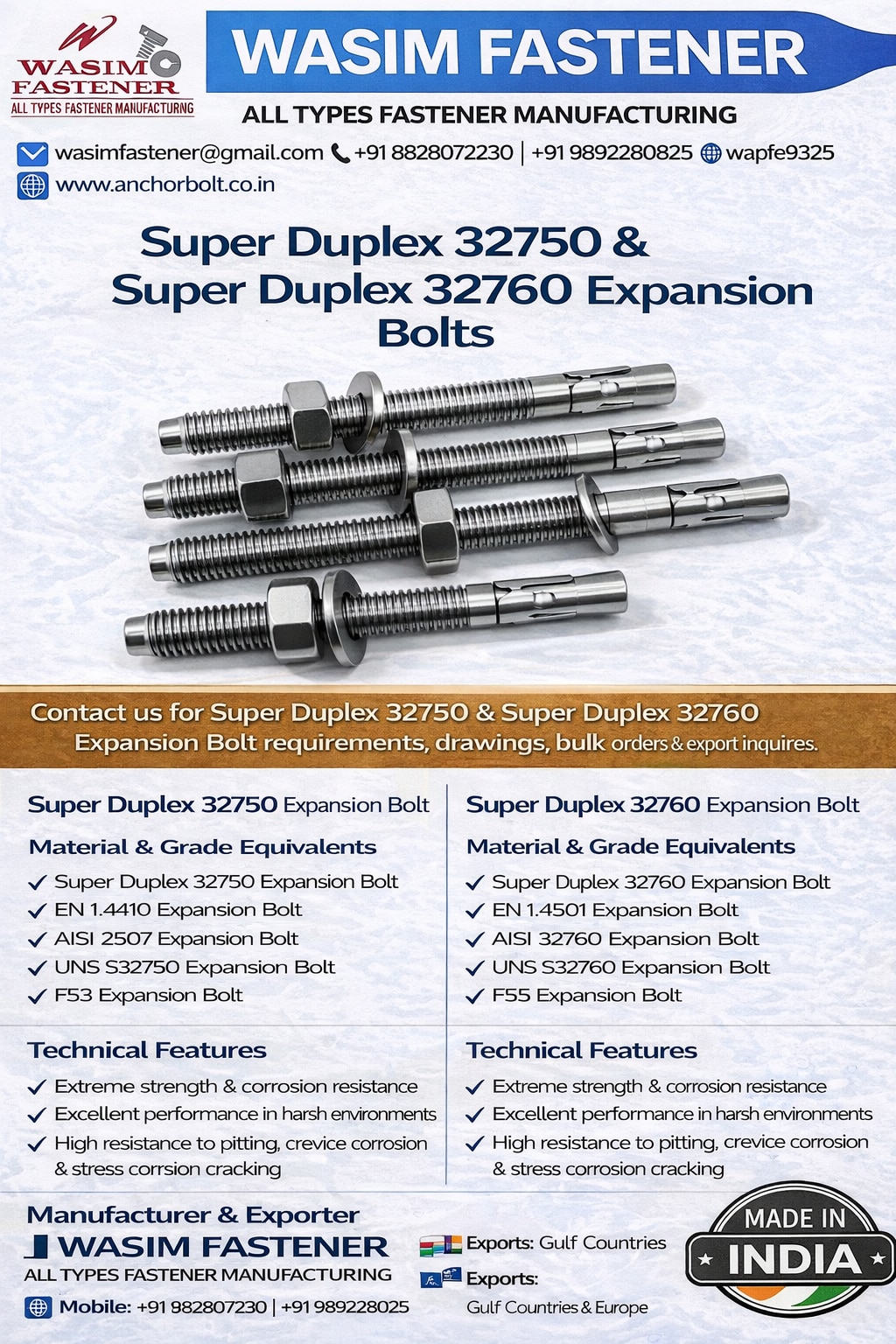 Super Duplex 32750 & 32760 Expansion Anchor Bolts Supplier | Offshore & Marine Fasteners Super Duplex 32750 & Super Duplex 32760 Expansion Bolts are high-performance stainless steel anchor fasteners engineered for extreme corrosion resistance, high mechanical strength, and long service life in aggressive environments. These grades combine the benefits of austenitic and ferritic structures, offering superior resistance to pitting, crevice corrosion, chloride stress corrosion cracking, and seawater exposure. Our Super Duplex 32750 Expansion Bolts (UNS S32750 / EN 1.4410 / F53) and Super Duplex 32760 Expansion Bolts (UNS S32760 / EN 1.4501 / F55) are designed for heavy-duty anchoring applications in concrete, structural foundations, offshore platforms, and marine structures. Due to their high yield strength and excellent fatigue resistance, these expansion bolts provide reliable load holding and secure anchoring even under extreme pressure and temperature conditions. These super duplex expansion anchor bolts are widely used in oil & gas, offshore platforms, marine construction, desalination plants, chemical processing units, power plants, shipbuilding, and coastal infrastructure projects. Available as wedge anchors, mechanical expansion anchors, and concrete anchor bolts, they ensure maximum safety and durability in the most demanding applications. As a trusted Super Duplex 32750 & 32760 Expansion Bolts manufacturer and exporter in India, we supply products in size ranges from M6 to M100, with custom lengths and specifications as per drawings and international standards. Our super duplex anchor fasteners are exported to USA, Gulf countries, Europe, Africa, and worldwide, meeting ASTM, EN, and international quality requirements. If your project demands maximum strength, extreme corrosion resistance, and long-term reliability, Super Duplex 32750 & 32760 Expansion Bolts are the ideal anchoring solution. Super Duplex 32750 Expansion Bolt Super Duplex 32760 Expansion Bolt Super Duplex Stainless Steel Expansion Bolt 32750 Anchor Expansion Bolt 32760 Anchor Expansion Bolt UNS S32750 Expansion Bolt UNS S32760 Expansion Bolt EN 1.4410 Expansion Bolt EN 1.4501 Expansion Bolt F53 Expansion Bolt F55 Expansion Bolt Super Duplex Wedge Anchor Bolt Super Duplex Mechanical Expansion Bolt Super Duplex Concrete Anchor Bolt Offshore Expansion Bolt Marine Grade Expansion Bolt Oil and Gas Anchor Fasteners Super Duplex Anchor Fasteners Manufacturer Expansion Bolt Manufacturer India Super Duplex Fasteners Supplier Expansion Anchor Bolts Exporter High Strength Expansion Bolt Corrosion Resistant Anchor Bolt Seawater Resistant Expansion Bolt Heavy Duty Expansion Anchor Bolt